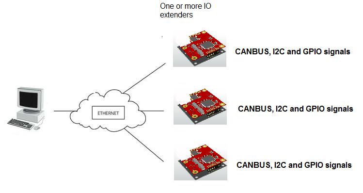 The IO Ethernet jumper allows the extension of Can-Bus, I2C and GPIO signals over an Ethernet medium. The device can work in two modes: